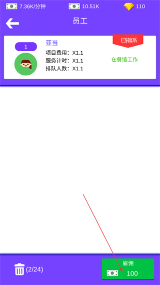 4、繼續(xù)進(jìn)行任務(wù)要求,可以回到餐館點(diǎn)擊員工信息界面點(diǎn)擊右下角雇傭按鈕增加新員工。