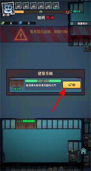 3、按照箭頭指引,在建筑升級界面點(diǎn)擊對應(yīng)的資源按鈕,消耗資源提升大門等級,增強(qiáng)防御能力。