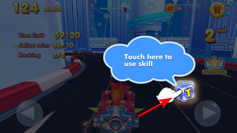 2、游戲中遵循技能使用規(guī)則,點擊界面中的技能圖標,可釋放對應技能,助力快速推進賽道進度。