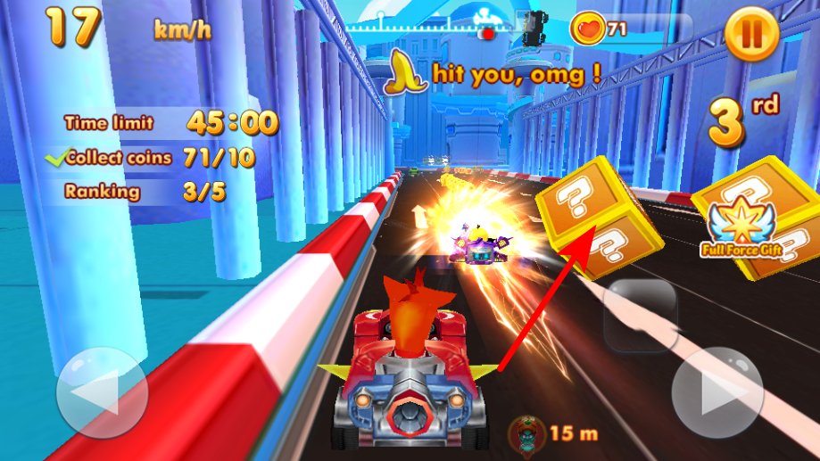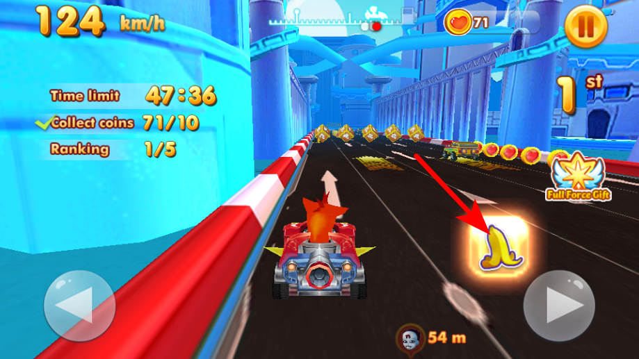 3、按照提示,駕駛賽車拾取賽道上的香蕉道具,該道具可對后方車輛造成干擾,幫助提升自身排名。