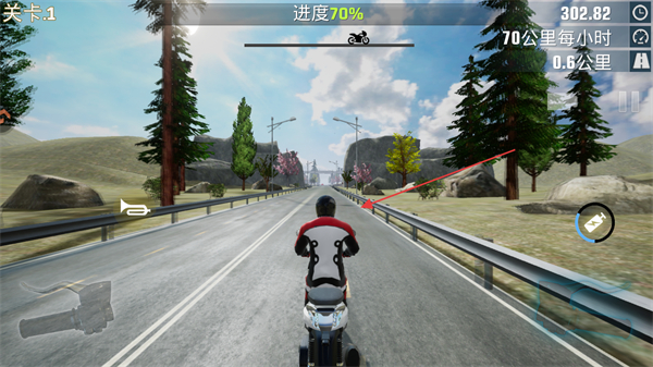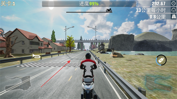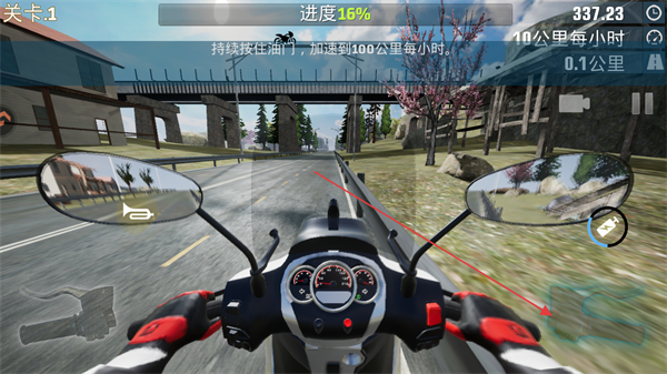 1、操控摩托時(shí),持續(xù)按住油門(mén)鍵加速,目標(biāo)是將速度提升到100公里/小時(shí),推進(jìn)關(guān)卡進(jìn)度。