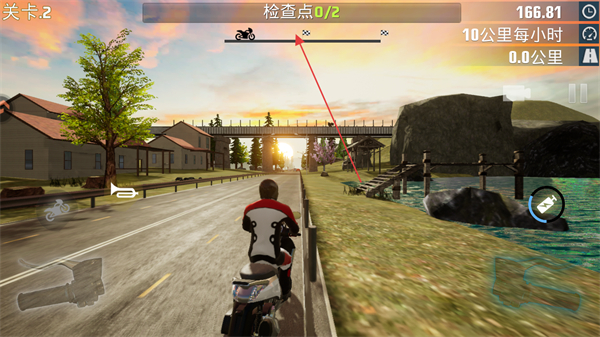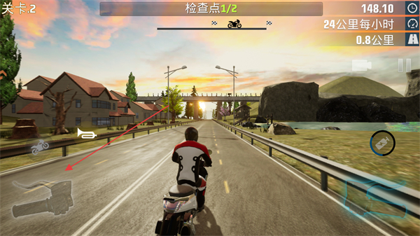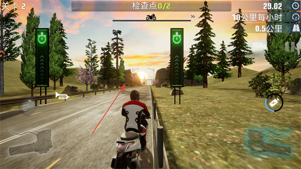 2、操控摩托沿道路行駛,依次通過綠色的檢查點裝置,積累檢查點進度。