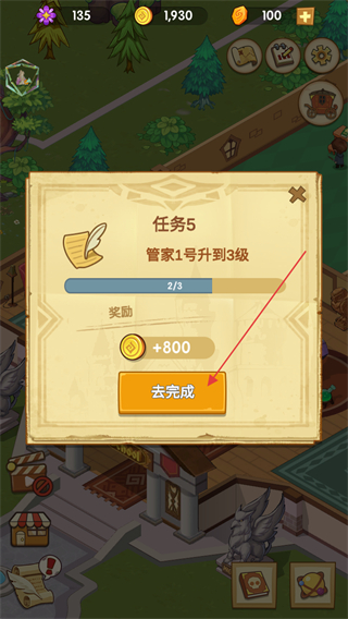 3、點擊任務5彈窗中的去完成按鈕,接取管家1號升到3級的任務。