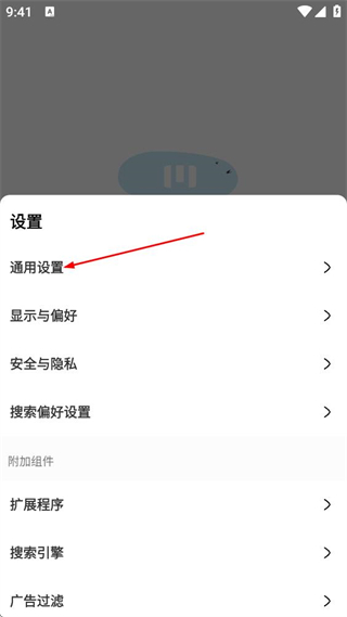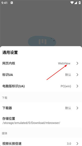 4、在通用設(shè)置頁面,點(diǎn)擊網(wǎng)頁內(nèi)核選項(xiàng),打開網(wǎng)頁內(nèi)核的選擇菜單。
