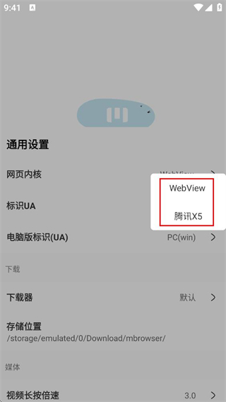 5、在網(wǎng)頁內(nèi)核選擇菜單中,選擇目標(biāo)內(nèi)核選項(xiàng),完成網(wǎng)頁內(nèi)核的設(shè)置操作。
