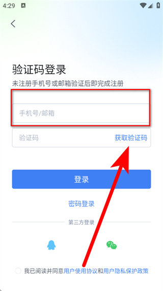 3、在登錄頁(yè)面,輸入手機(jī)號(hào)郵箱,點(diǎn)擊獲取驗(yàn)證碼。