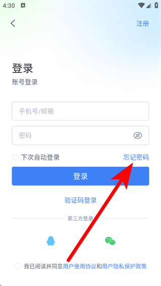 3、在密碼登錄頁面,點(diǎn)擊忘記密碼,進(jìn)入重置密碼界面。