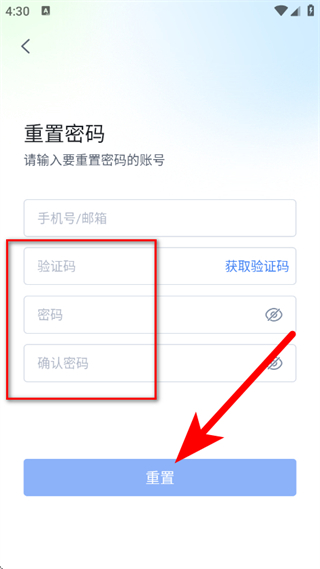 5、輸入驗(yàn)證碼,設(shè)置并確認(rèn)新密碼后,點(diǎn)擊重置,完成密碼重置。