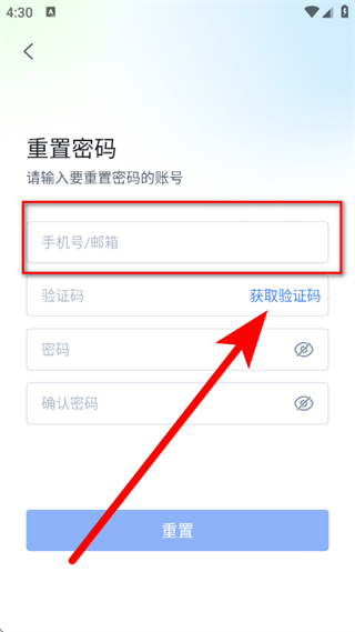 4、在重置密碼頁面,輸入手機(jī)號郵箱,點(diǎn)擊獲取驗(yàn)證碼。
