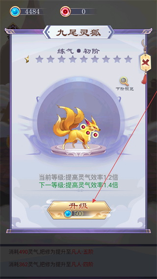 2、在靈寵九尾靈狐的信息界面,靈寵處于煉氣初階,消耗500靈氣可升級靈寵,升級后靈氣獲取效率會提升當(dāng)前升級后從1.2倍升至1.4倍,其等級與修煉效率掛鉤。