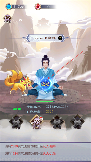 3、修煉效率因靈寵輔助提升至271,下階突破需滿足3325的修為需求,界面中的渡劫按鈕是突破凡人境界,邁向更高階的關(guān)鍵操作,需積累足夠資源后觸發(fā)。