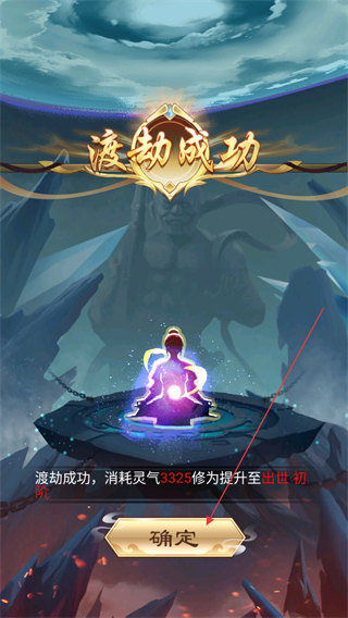 4、渡劫成功后的反饋界面,修為已提升至出世初階,這是跨越凡人境界后的新修煉階段,點(diǎn)擊確定按鈕可返回修煉界面繼續(xù)后續(xù)修煉。