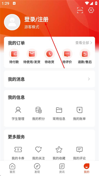 2、在個人頁面,點擊登錄/注冊選項,進入短信驗證碼登錄頁面。
