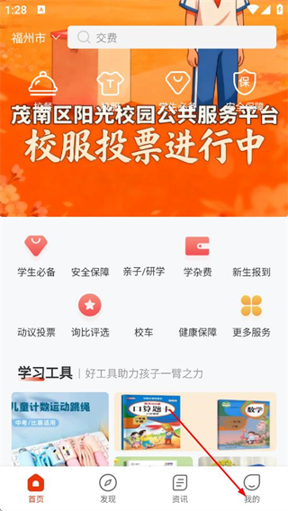 1、在陽光校園公共服務(wù)平臺首頁,點擊底部我的,進入個人頁面。