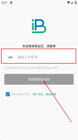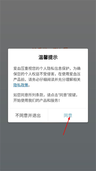 1、在溫馨提示彈窗中,點(diǎn)擊同意按鈕,進(jìn)入愛血壓的登錄頁面。