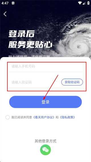 3、在登錄頁面,填寫手機(jī)號(hào)、獲取并輸入驗(yàn)證碼,點(diǎn)擊登錄,完成賬號(hào)登錄。