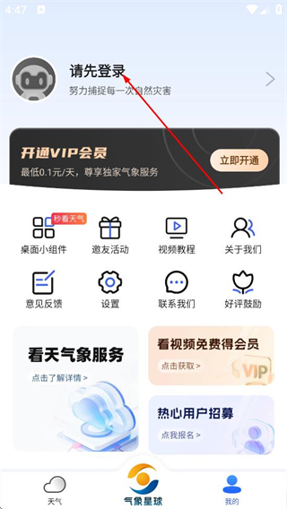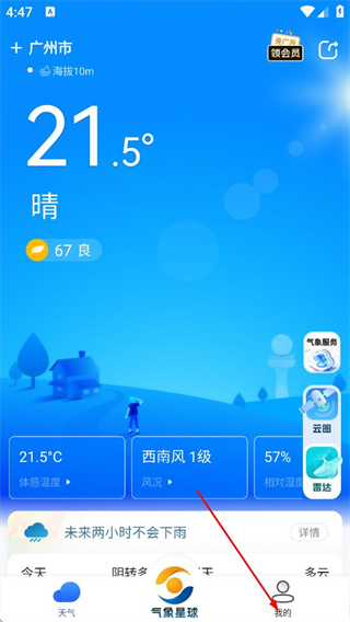 1、在看天氣應(yīng)用首頁,點(diǎn)擊底部導(dǎo)航欄的我的,進(jìn)入個(gè)人頁面。