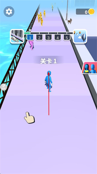 1、進入關卡1界面,跟隨指引操控藍色角色,沿賽道向前移動,靠近前方的其他角色。