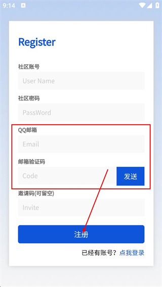 5、繼續(xù)填寫QQ郵箱、郵箱驗證碼,點擊注冊,完成賬號注冊。