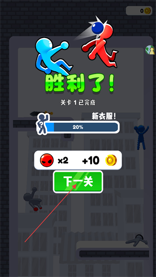 4、關(guān)卡勝利后顯示勝利了提示并獲得獎勵,點擊界面中的下一關(guān)按鈕即可進入后續(xù)關(guān)卡游玩。