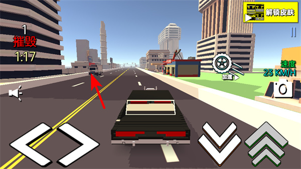 3、通過左側(cè)的方向按鈕控制車輛左右移動,調(diào)整行進路線,瞄準道路上的車輛、建筑等目標進行撞擊,積累次數(shù)與游戲積分。
