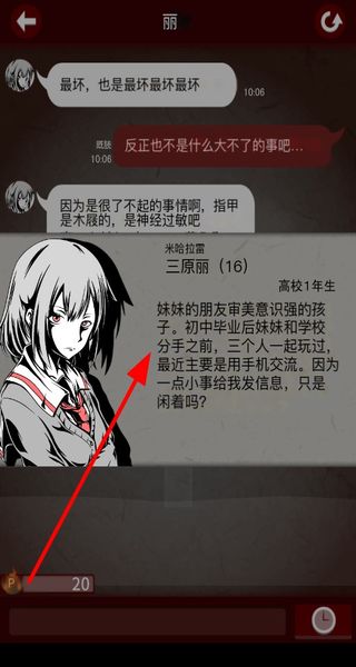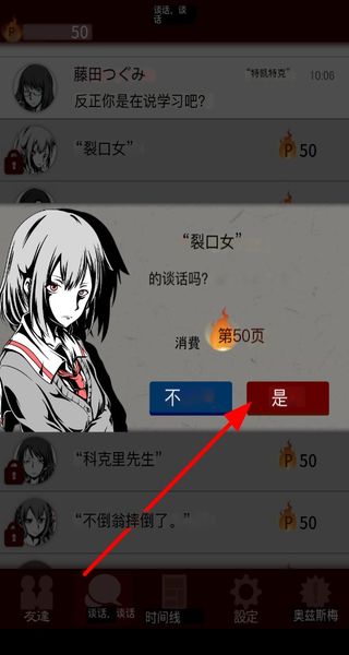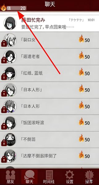 2、當(dāng)P值滿足要求時(shí),選擇對(duì)應(yīng)角色點(diǎn)擊解鎖選項(xiàng),消耗P值開啟新角色的聊天,解鎖更多劇情線。