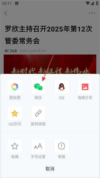 4、在分享菜單中,選擇微信,即可將新聞分享到微信。