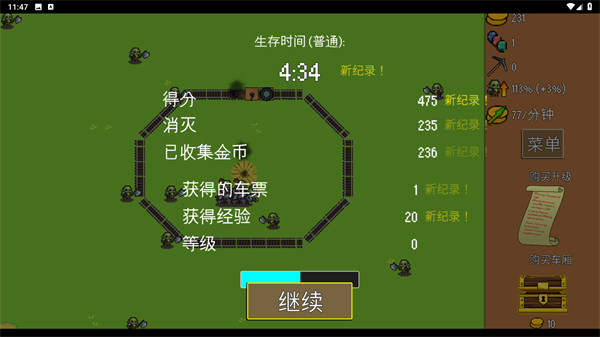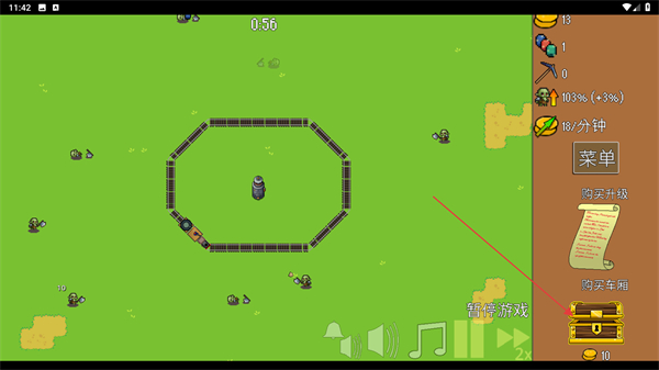 2、進入游戲關(guān)卡后,通過界面右下角的寶箱購買車廂功能獲取防御車廂,將其布置在軌道區(qū)域,以此抵御來襲的敵人。