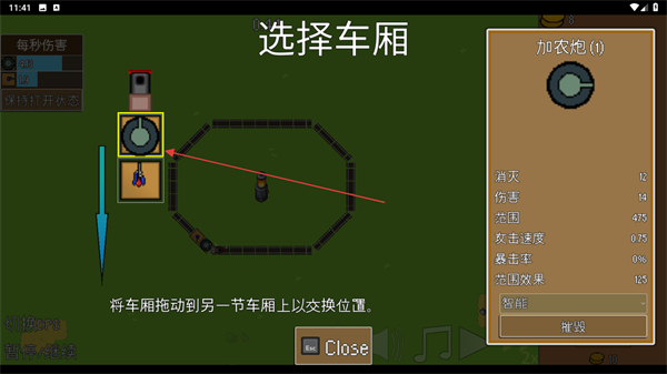 4、在選擇車廂界面,將加農(nóng)炮車廂拖動至軌道的目標位置,交換車廂位置以優(yōu)化布局,提升整體防御效果。