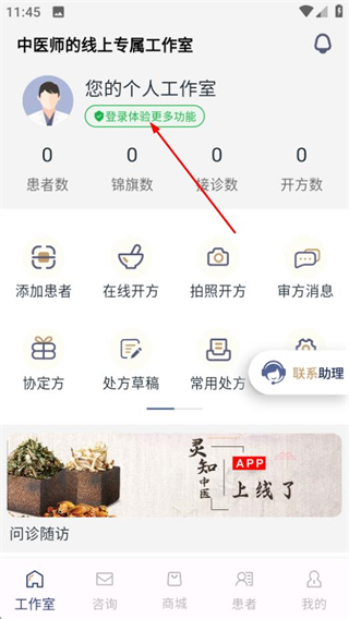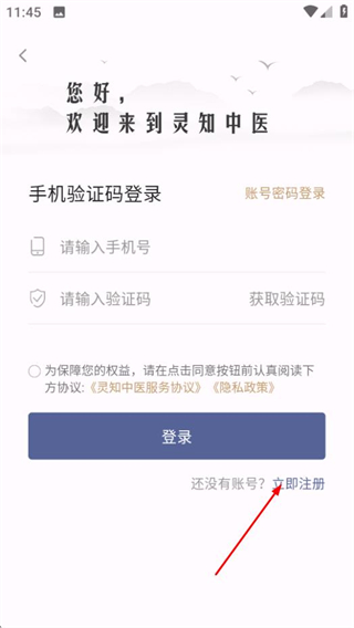 1、在靈知中醫(yī)首頁(yè),點(diǎn)擊登錄體驗(yàn)更多功能區(qū)域,進(jìn)入登錄頁(yè)面。