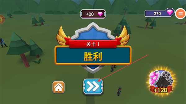4、在關(guān)卡1勝利界面中,可以看到因?yàn)閼?zhàn)斗勝利獲得了20個(gè)鉆石獎(jiǎng)勵(lì),點(diǎn)擊箭頭按鈕,即可進(jìn)入后續(xù)關(guān)卡。