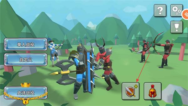 1、在游戲主界面上,點(diǎn)擊右下角的盾牌標(biāo)識按鈕可以升級士兵增強(qiáng)戰(zhàn)力,開啟對應(yīng)的戰(zhàn)役挑戰(zhàn)。