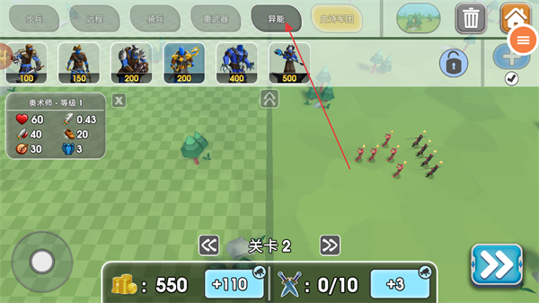 3、切換到異能分類,選擇奧術(shù)師-等級1兵種,消耗資源將其部署至關(guān)卡2的戰(zhàn)場中。