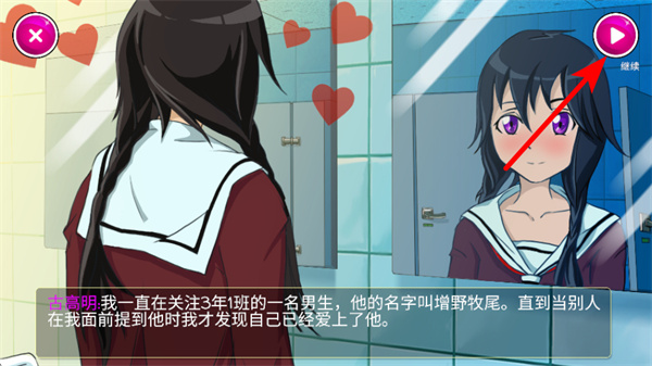 1、在劇情界面,點(diǎn)擊繼續(xù)按鈕可推進(jìn)故事內(nèi)容,了解角色的背景設(shè)定如暗戀的對象,這是開啟互動(dòng)玩法的基礎(chǔ)操作。