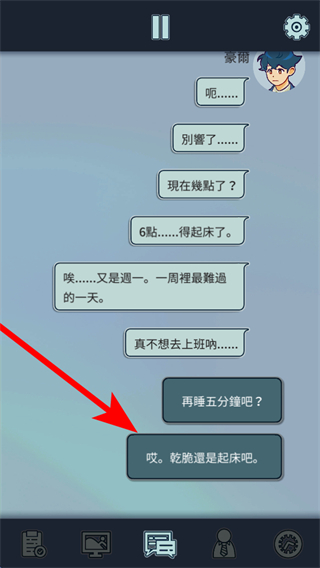 2、在起床選擇界面,點(diǎn)擊哎,乾脆還是起床吧選項(xiàng),這是推進(jìn)晨間劇情的核心操作,選擇后可進(jìn)入下一個(gè)生活場(chǎng)景。