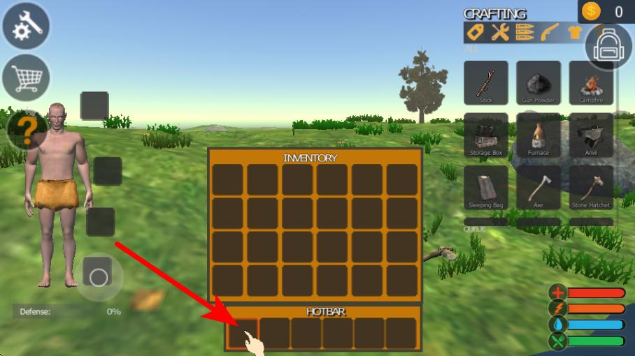 4、打開背包界面后,將獲取的道具拖入快捷欄,可快速調用道具,提升資源使用的效率,為后續(xù)的生存挑戰(zhàn)如狩獵、建造做準備。