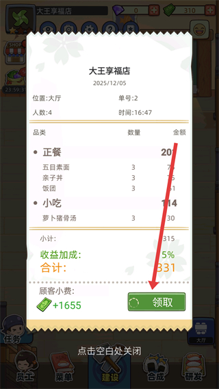 4、等待客人吃完,即可自動打出小票,點擊下方領取,即可獲得額外獎勵。