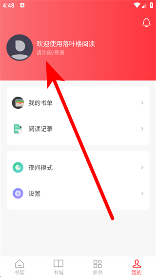 1、打開落葉樓閱讀,點擊底部的我的,進(jìn)入我的頁面。