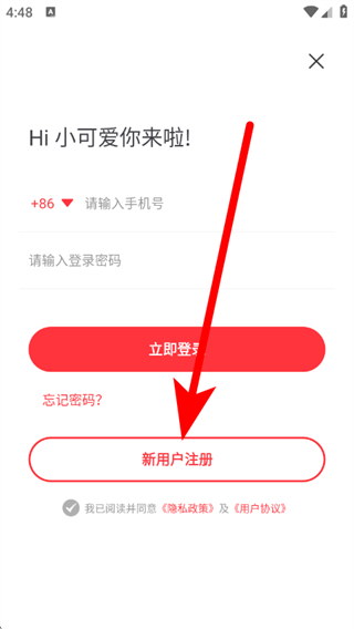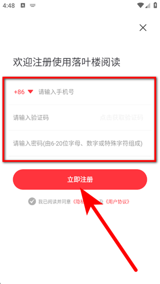 4、在注冊頁面,輸入手機號、驗證碼、密碼,勾選協(xié)議后,點擊立即注冊,完成注冊。