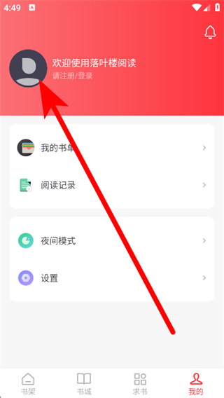 1、打開落葉樓閱讀,點(diǎn)擊底部的我的,進(jìn)入個(gè)人頁面。
