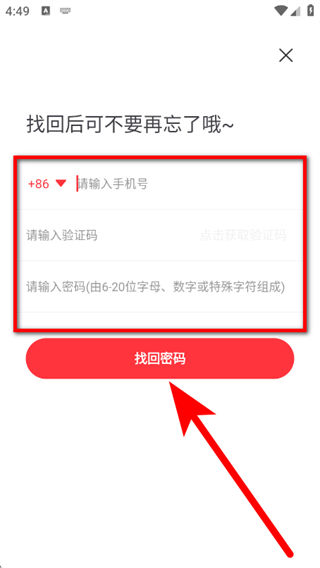 4、在找回密碼頁面,輸入手機(jī)號(hào),設(shè)置新密碼,點(diǎn)擊找回密碼,完成操作。