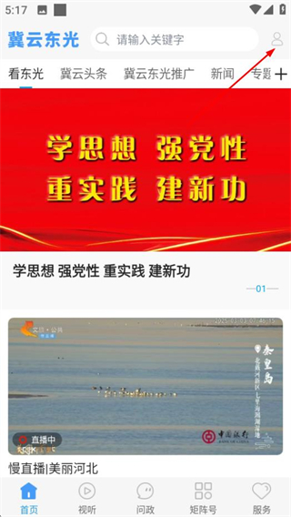 1、在冀云東光的首頁(yè),點(diǎn)擊右上角的個(gè)人圖標(biāo),進(jìn)入個(gè)人功能頁(yè)面。