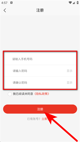 4、在注冊(cè)頁面,輸入手機(jī)號(hào)碼,設(shè)置密碼,勾選協(xié)議后,點(diǎn)擊注冊(cè),完成注冊(cè)。