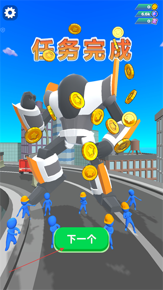 4、成功擊倒敵方后,界面會(huì)顯示任務(wù)完成,點(diǎn)擊下方下一個(gè)的按鈕,即可進(jìn)入下一個(gè)戰(zhàn)斗關(guān)卡,挑戰(zhàn)新的敵方目標(biāo)。