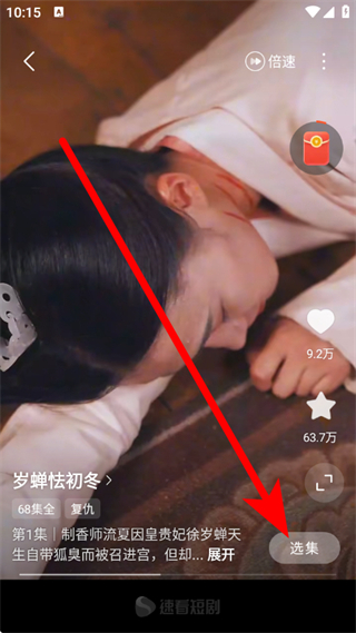 3、在短劇播放頁面,點擊選集,展開集數(shù)選擇界面。