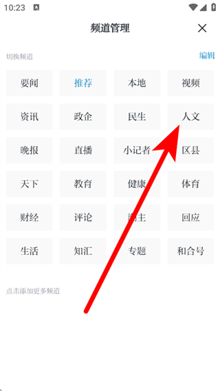 2、在頻道管理界面,點(diǎn)擊選擇人文頻道,切換至人文內(nèi)容頁面。