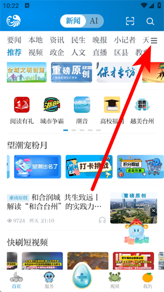 1、打開望潮新聞,點(diǎn)擊頂部頻道欄右側(cè)的橫桿,進(jìn)入頻道管理界面。