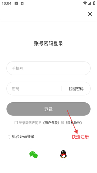 3、在登錄頁面,點擊快速注冊選項,進入注冊頁面。