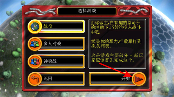 1、在游戲選擇界面,選擇對應(yīng)玩法模式如戰(zhàn)役后點(diǎn)擊開始按鈕,可進(jìn)入策略對戰(zhàn)關(guān)卡,這是開啟戰(zhàn)棋玩法的基礎(chǔ)操作。