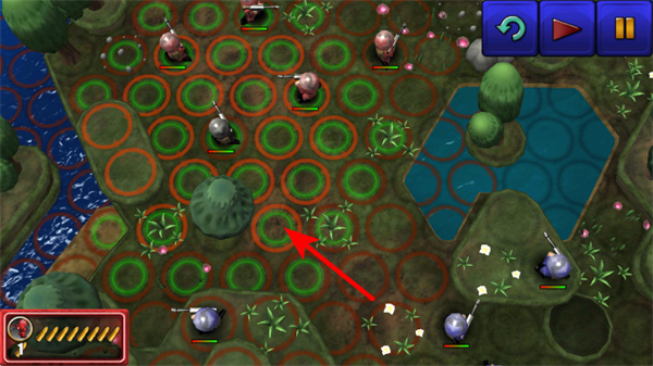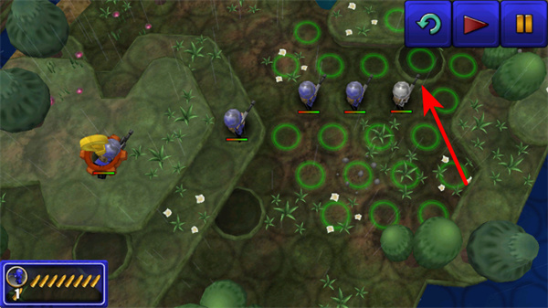 2、進(jìn)入戰(zhàn)場后,點(diǎn)擊己方部隊(duì)單位,可選中該單位并顯示其可移動范圍綠色區(qū)域,根據(jù)戰(zhàn)場局勢選擇合適的移動位置。